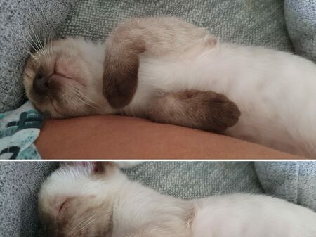 Le gusta echarse unas siestas de unas 5 horas, con la lengua fuera sobre todo, y jugar con todo lo que pille, ya sean tapones, bolsas, etc. Además le encanta dormir en el lavabo y que le abramos el grifo para refrescarse.