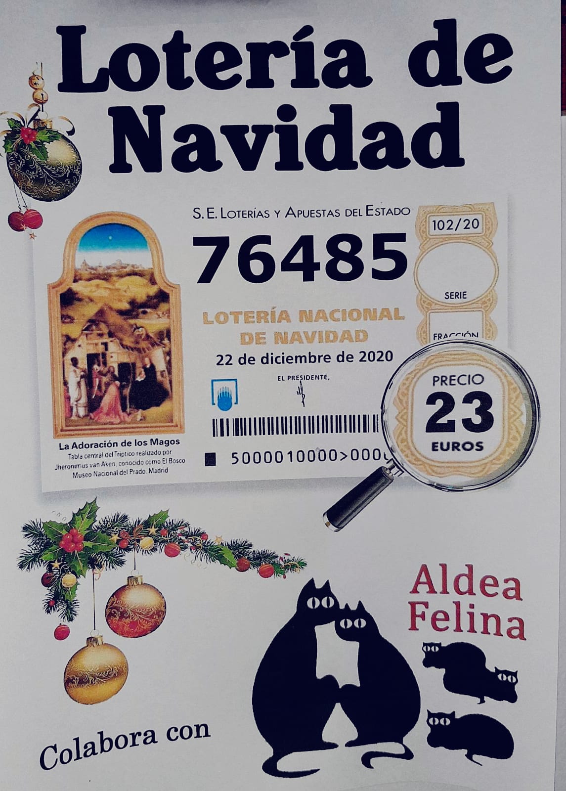 Arbeiten Sie mit der Verein zusammen und kaufen Sie Ihr Zehntel. Sie können es in unserem Geschäft in Els Poblets und in der Tierklinik La Marina in Dénia erhalten. Dieses Jahr werden wir das Glück haben zu gewinnen. Verpassen Sie Ihre nicht.