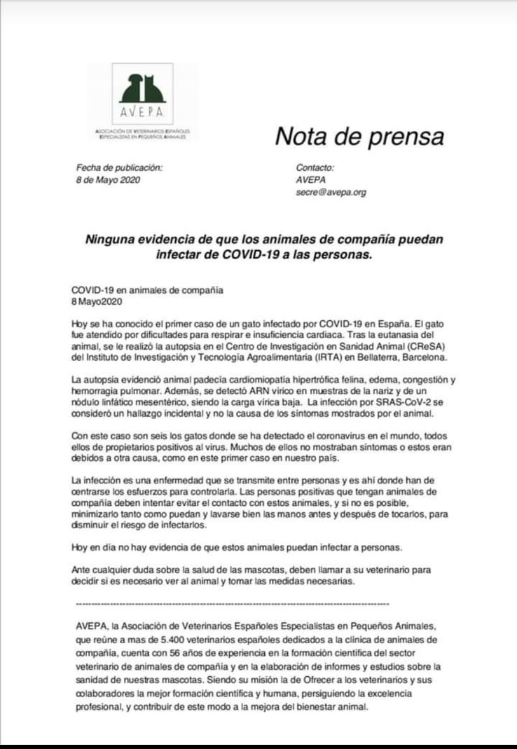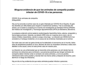 Here you can read the official text of the Association of Spanish Veterinarians Specialists in Small Animals (AVEPA). It clearly states that as of today, there is no scientific proof that our pets can catch or transmit CoVid-19 to us. The international organization WSAVA and the American AVMA have the same position.