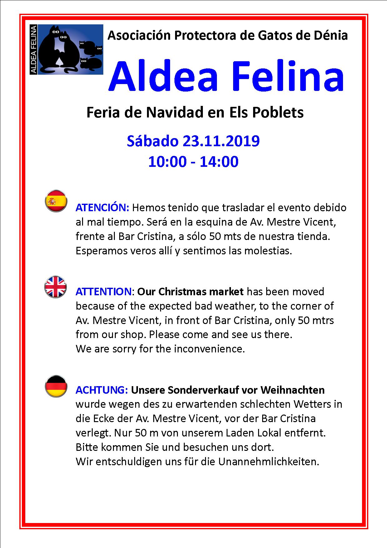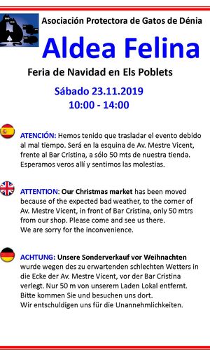ATTENTION: Our Christmas market has been moved because of the expected bad weather, to the corner of Av. Mestre Vicent, in front of Bar Cristina, only 50 mtrs from our shop. Please come and see us there. We are sorry for the inconvenience.
