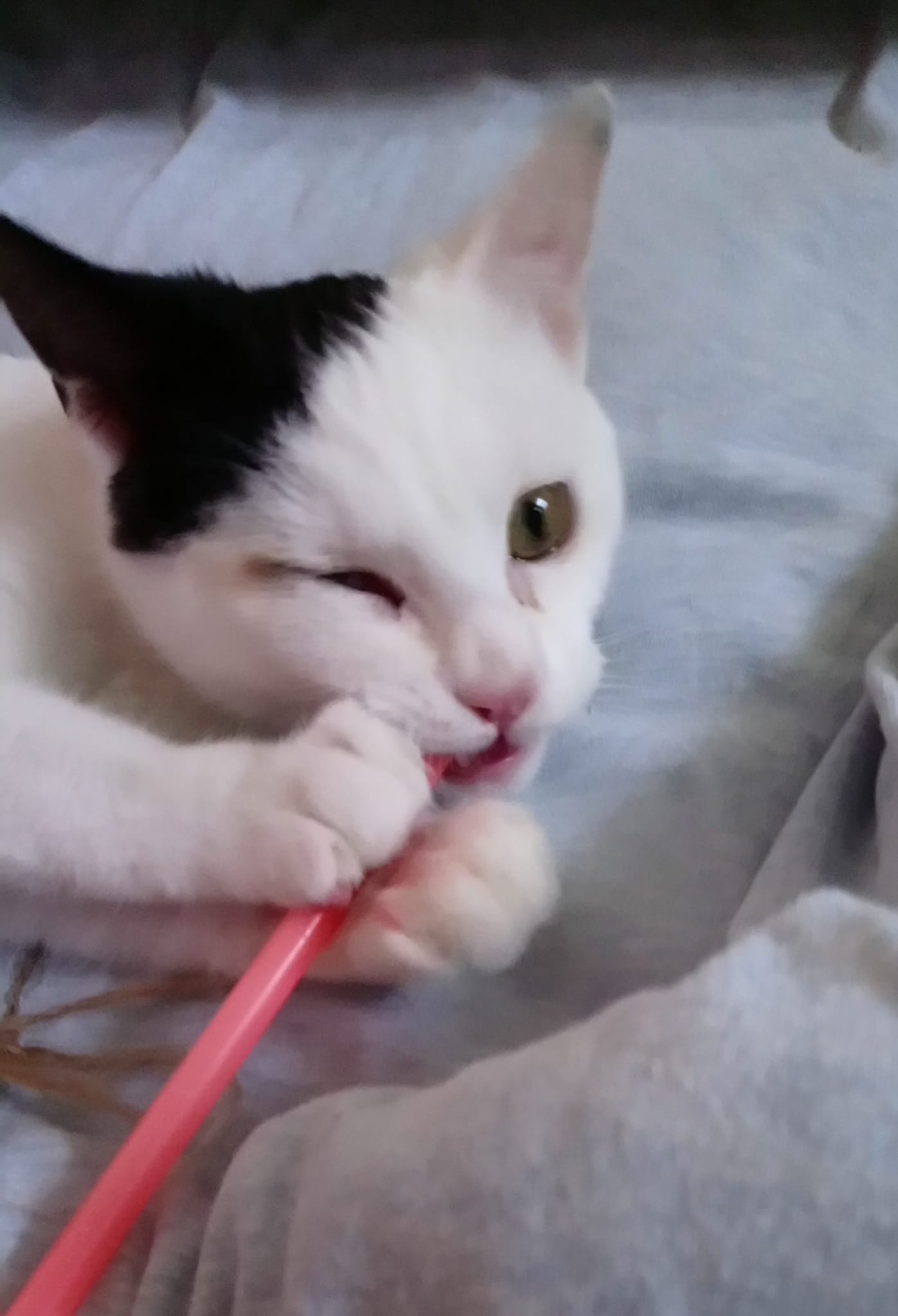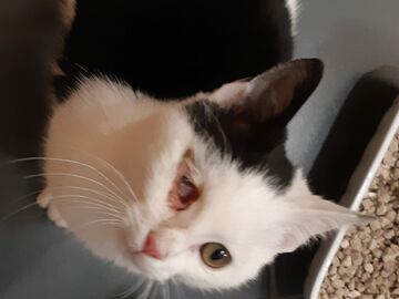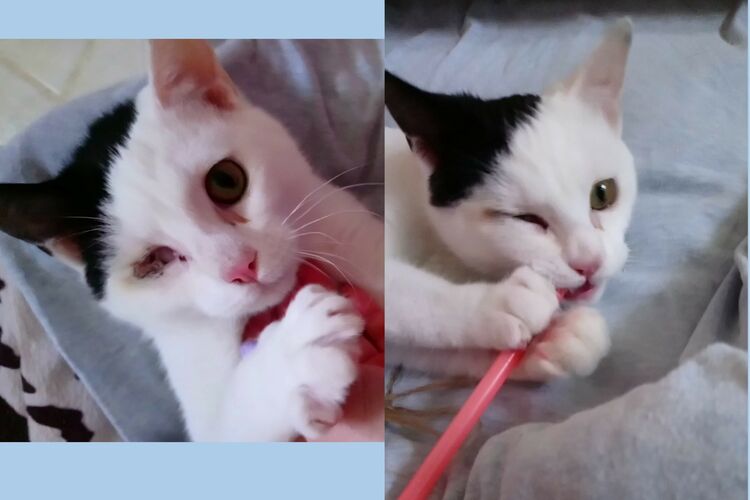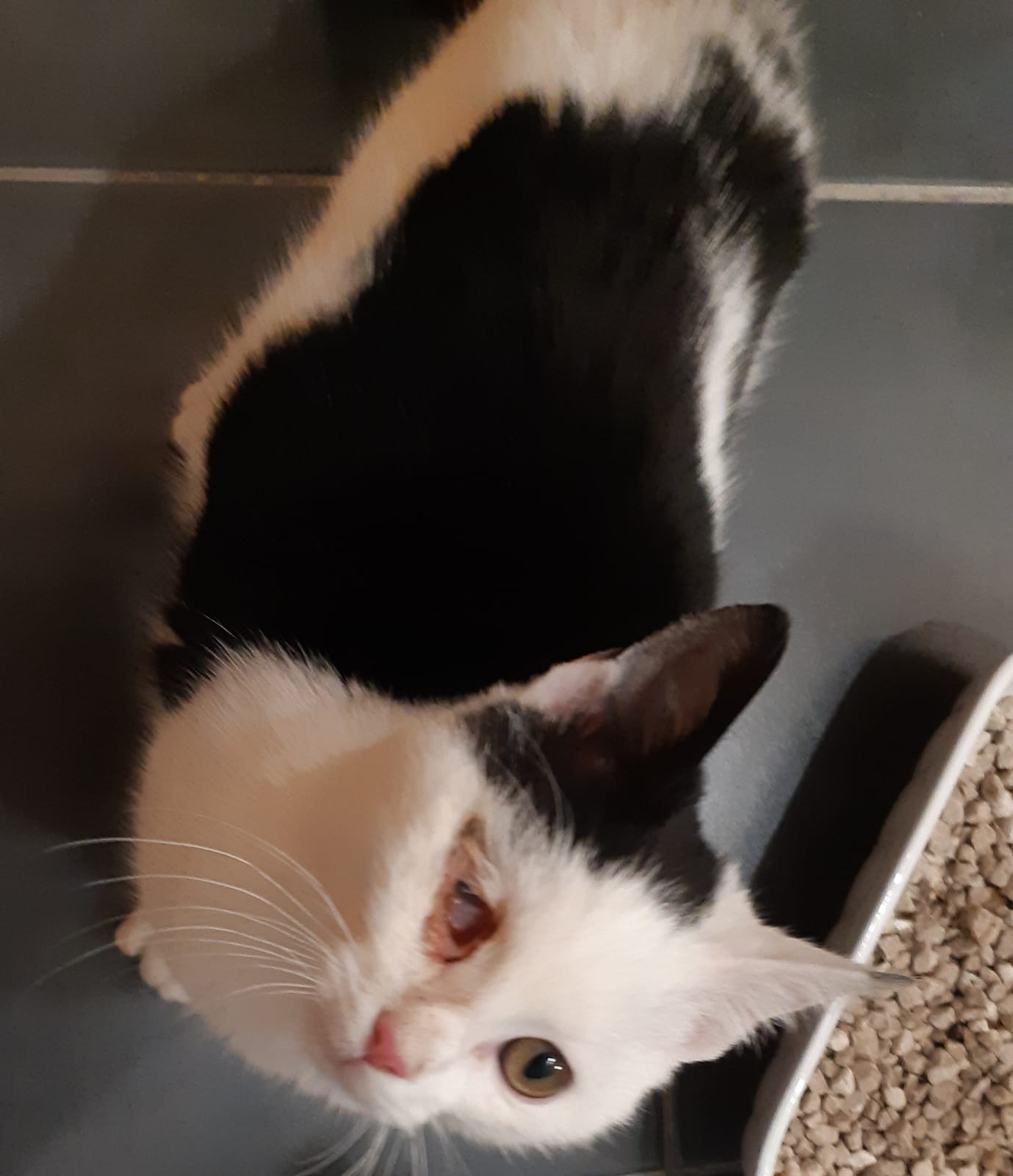 Oki is a black and white kitten who has won us over with his good character. He is playful and affectionate, everyone loves him. Sadly, he arrived to us at Aldea Felina in December 2021 with his right eye in a very bad condition. We think he was abandoned because of this. He couldn't be operated right away because he was too small, so we have been taking care of him and giving him treatment until he was big enough to be operated on. The best and only thing we can do for him, is to remove the damaged eye and close the skin on his eyelids, so that he has a clean wound which will not make any problems in the future.