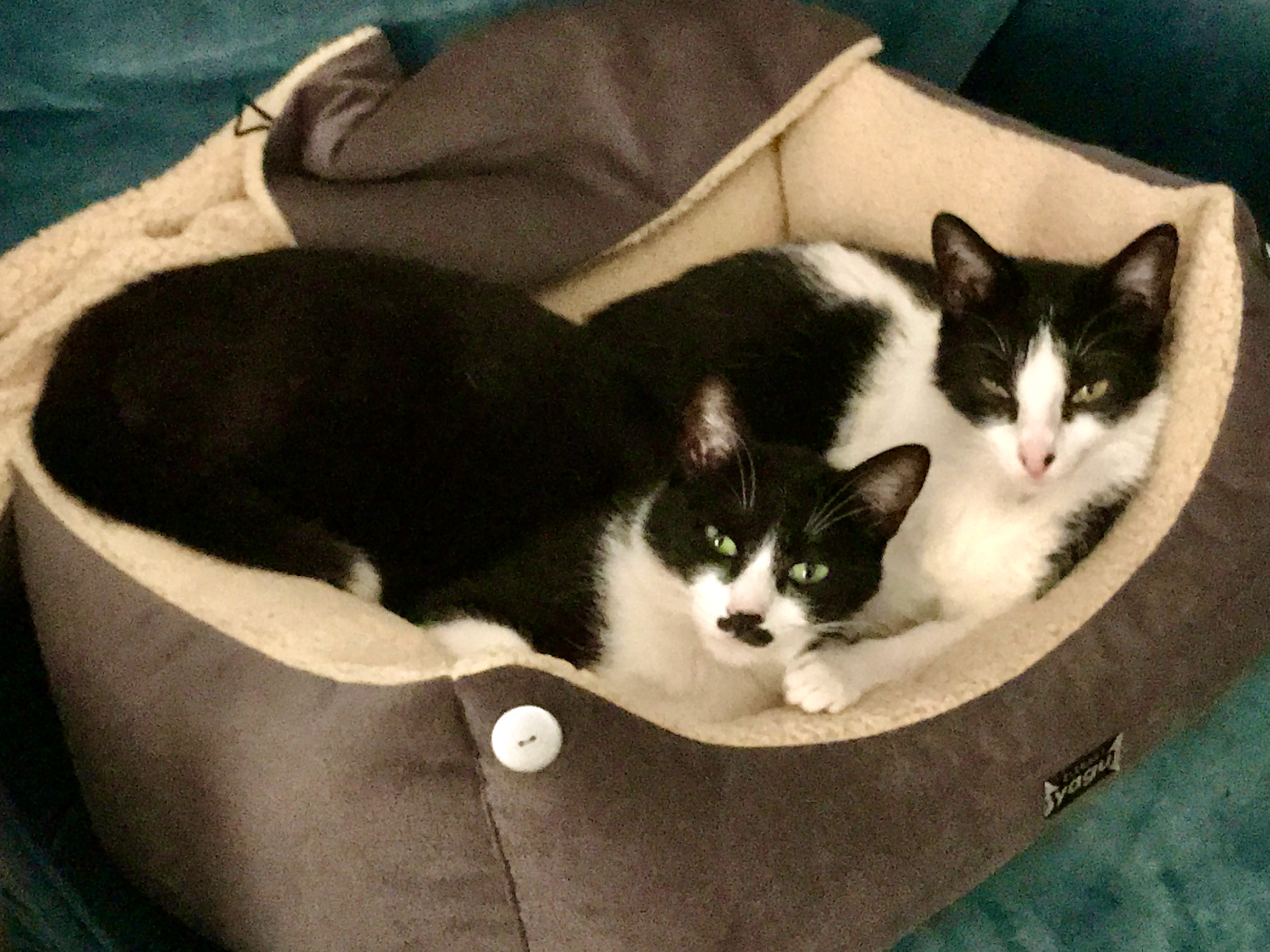 They are completely lovely and chase each other around the house every evening, play-fighting. When either of them needs comfort – the other is there for them – giving them a good lick.