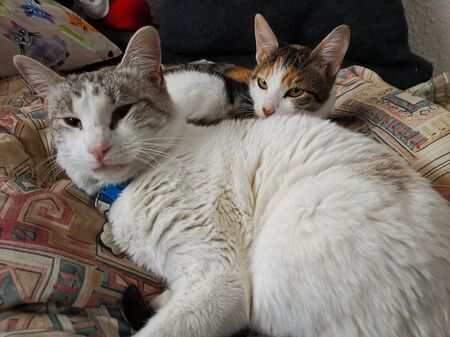 Naevia es feliz con sus 3 hermanos gatunos. Una de ellas Ágata tambien adoptada a través de aldea felina. En la foto está con su "papi" Ramsés que la mima mucho. Laura