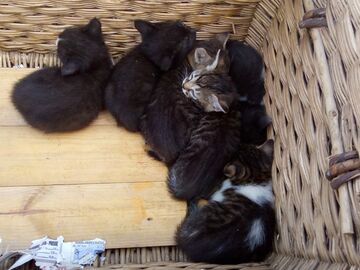There are 6 babies, about 4 weeks old, who had been with their mother until some unforgiving person took them to the rubbish bins. How many times do we have to say that this does not solve anything? The poor mother cat is going to go into heat immediately, to get pregnant again and repeat the sad story over and over again. The solution is to neuter the mother cat and stop that loop once and for all!