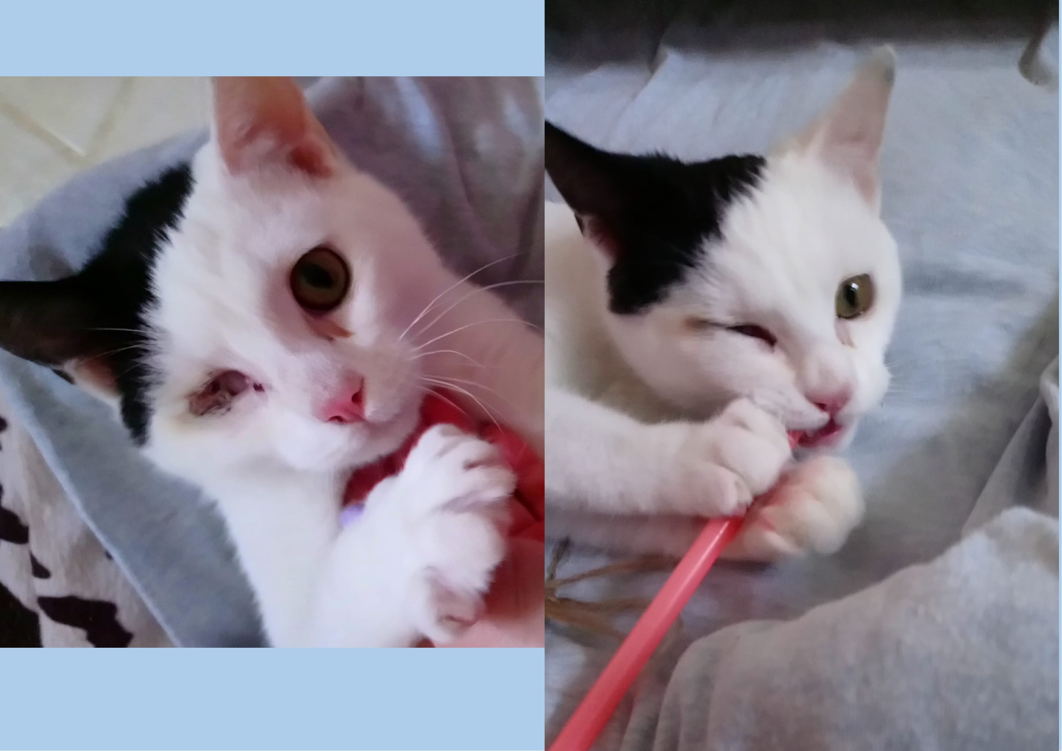 Oki is a black and white kitten who has won us over with his good character. He is playful and affectionate, everyone loves him. Sadly, he arrived to us at Aldea Felina in December 2021 with his right eye in a very bad condition. We think he was abandoned because of this. He couldn't be operated right away because he was too small, so we have been taking care of him and giving him treatment until he was big enough to be operated on. The best and only thing we can do for him, is to remove the damaged eye and close the skin on his eyelids, so that he has a clean wound which will not make any problems in the future.